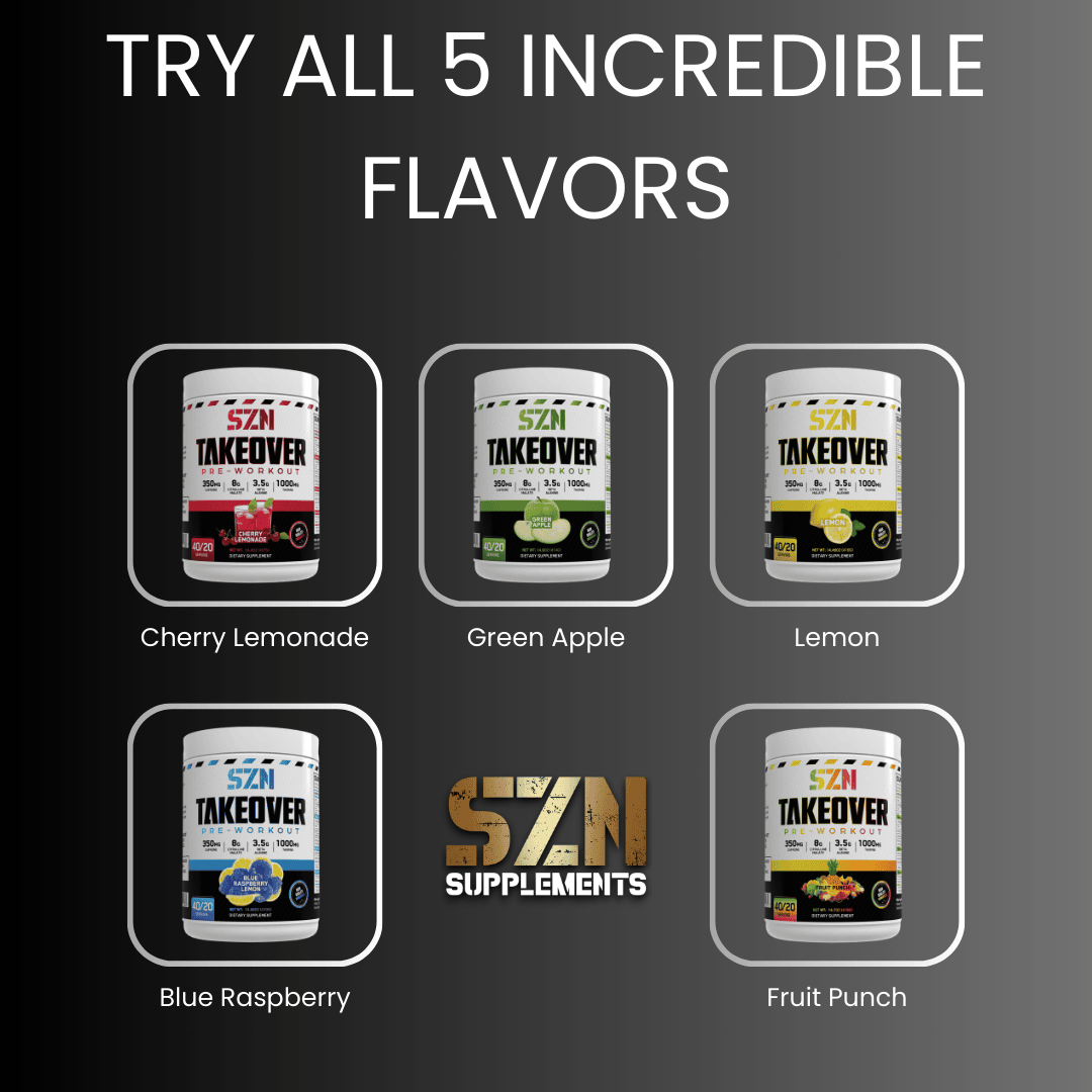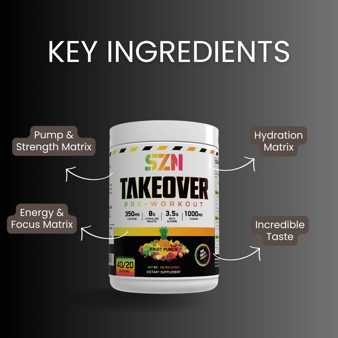 Are you ready to dominate your workouts and take your training to the next level? SZN - Takeover Pre-workout is here to fuel your ambition and power your performance. Designed for athletes and fitness enthusiasts who demand the best, our formula delivers unmatched energy, strength, and hydration to help you crush your goals.